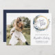 This boho save the date card features a boho watercolor wreath of white flowers, dried foliage and a blue moon on a gold circular frame. Easily replace the sample image with a photo of the two of you. Customize the elegant navy blue handwriting script with the names of the bride and groom, and the sans serif text with the date and location. The reverse side is a matching shade of solid navy blue.