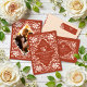 The pre-wedding save-the-date card features a watercolor artwork of a beautiful white floral frame. The background is a warm, earthy red color. The wording on the front and the photo on the back can be easily customized or replaced. Perfect for an elegant vintage or modern bohemian-style fall or winter wedding, as well as weddings in any season.
