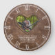 Brown leather printed faux graphic stitched heart wedding anniversary clock, with graphic style crystals on each hour, customize with your own couples photo, year of marriage, and names or relationship to you. The example reads Maria and Preston Martinez Third Wedding Anniversary and your marriage and anniversary date or message. The traditional 3rd-anniversary gift is leather and the modern third-anniversary gift is crystal (or glass), this design, therefore, has a little bit of both! Other matching items are available. Leather hearts and Crystal heart effect graphic art and design by Sarah Trett for www.mylittleeden.com