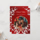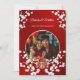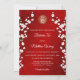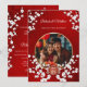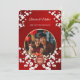 This elegant Chinese wedding invitation features a round photo surrounded by white cherry blossom branches and a round gold double happiness symbol on a shimmering floral red background. Bride and groom names in an elegant classic script. Chinese wedding invitation or tea ceremony invitation.