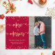Gold Burgundy Photo Christmas Pregnancy Announcement Cards. Expecting parents! Modern gold swirly hand lettered typography script "the more the merrier" card to share your happy news with family and friends in the holiday season. Features above and the bottom gold confetti frame on burgundy background. You can personalize the design by replacing the simple texts and vertical photo. #3351 If you need help or matching items, please contact to me!