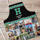 Create your own custom photo apron! This stylish template showcases fifteen of your favorite photographs, and is personalized with a monogram letter and text — ideal for a single name, pet's name, sports team, or family surname. You can also customize the background color by using the design editor tool. This stylish design features a retro block font, with a sports jersey style, and is perfect for all ages, including kids, teenagers, and adults. Custom aprons are a lovely addition to your kitchen, and make a unique gift for friends and loved ones. Printed colors: blue-green green, black and white.