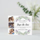 Decorated with lavender florals and eucalyptus greenery. A Save the Date card for your wedding. The text: Save the Date is written with a large trendy hand lettered style script. Personalize and add a 3 photos.