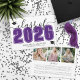 A classic yet modern horizontal graduation announcement. The front features an oversized “Class of” in bold black with “2025” in a rich purple tone for a bold, eye-catching contrast, accented by elegant gray script. Two graduation cap icons add a celebratory touch, with space below for the graduate’s name and school. Colors can be customized to match school colors or personal style for a fully personalized look.