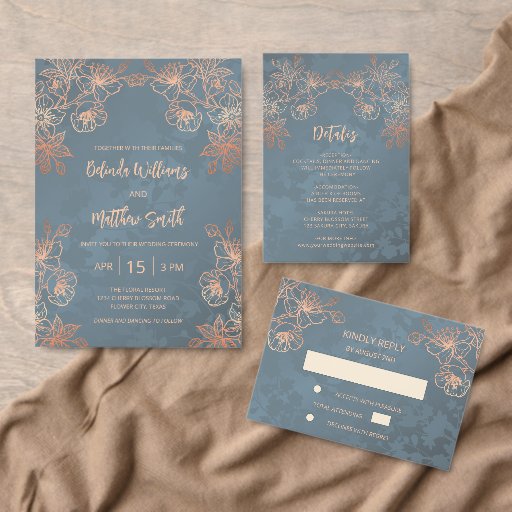 Make a sophisticated statement with this elegant wedding invitation, featuring unique, hand-drawn floral line art in a shimmering copper tone. Set against a serene dusty blue background, the intricate vector illustration creates a refined botanical frame that balances modern artistry with classic heritage style. The clean, symmetrical layout and professional graphic details make it perfect for couples seeking a high-end, artistic look for their garden or formal celebration. This design showcases custom-crafted artistry for a truly memorable first impression.