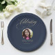 Photo Elegant Blue Gold Script Funeral Memorial Paper Plates