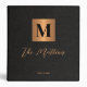 Stylish modern luxury monogrammed initial and signature script family name personalized wedding memories or planning album binder featuring a faux metallic gold copper square with initial letter, 8 custom photos, wedding rings, and your text over a black leather like (PRINTED TEXTURE) background.
