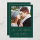 This simple, minimalist Save the Date card features a square photo above the words "Save the Date" in elegant gold-colored handwriting script, followed by the couple's names, wedding date and city in sans serif font on an emerald green background. Add a more detailed message with additional information on the reverse, along with a QR code to help your guests visit your wedding website.