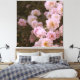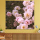 Branches of romantic powder pink roses on a dark foliage background, photography.