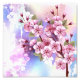 Artistically drawn, branch of pink, cherry blossoms on picturesque, textured background, painted over with white, pink and blue paint. Pink Sakura