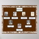 A three-generation photo family tree is featured on a brown background on this poster. Personalize with your own ancestor's photos and names. The poster is bordered with white swirls. If you need help, please contact me.