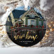 Commemorate your first Christmas in your new home with this beautiful modern keepsake ornament. The text reads "First Christmas in our new home," with the words "new home" in elegant gold faux foil script. Replace the sample image with a photo of your new house and add your family's last name in white sans serif font. A dark gradient filter helps make the text pop.