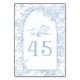 Photo French Toile Blue and White Floral Wedding Table Number Card. Blue Chinoiserie Toile de Jouy inspired style. This table card has a soft, elegant style with a muted blue that feels calming and timeless. The fonts mix classic serif with flowing script, giving it a balance of formality and warmth. Delicate floral illustrations add a touch of whimsy and nature-inspired charm. Overall, the design feels romantic yet understated, perfect for a vintage or traditional wedding.