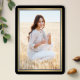 Share the joy of a high school or college graduation with these custom photo navy blue, gold and white announcements. (IMAGE PLACEMENT TIP: An easy way to center a picture exactly how you want is to crop it before uploading to the Zazzle website.) This formal style template includes parents' and graduate's names, as well as any wording of your choice, such as party invitation details, special honors, degree title, favorite inspirational quote, graduate's contact info, future education plans, or new job position. All text is simple to personalize. Design features a modern blue ombre background, faux gold foil border & mortar board cap, elegant script calligraphy, traditional typography, and one photo of your choice, such as a senior picture or image from the commencement ceremony. Please note that gold is printed color, not metallic foil. These graduation announcement cards are a trendy and chic way to share your special day celebration with family and friends. Congratulations to the graduate!