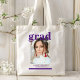 Photo Graduation Party Elegant Modern Script Tote Bag feature your favorite photo with the simple purple text "Grad (year)" and your name and personalized graduation details on the front. Perfect for the grad as a graduation gift or graduation party decor. Created by ©2023 Evco Studio www.zazzle.com/store/evcostudio