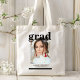 Photo Graduation Party Elegant Modern Script Tote Bag feature your favorite photo with the simple black text "Grad (year)" and your name and personalized graduation details on the front. Perfect for the grad as a graduation gift or graduation party decor. Created by ©2023 Evco Studio www.zazzle.com/store/evcostudio