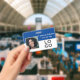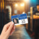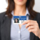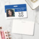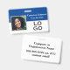 This custom identification badge features a sample photograph to the left of a name and job title, over a blue background. A sample company or business logo is placed in the bottom right, which you can replace with your own custom logo or other image. The back of the photo ID badge contains contact details and additional information.