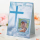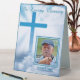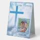 These tabletop signs featuring a photo of your deceased loved one are great to use in a variety of locations at your final remembrance service: with the guest book, on hallway tables or bookcases, side tables, as part of a centerpiece grouping. It is simple to personalize as you swap a photo of your loved one along with birth and death dates. The background is a gorgeous photo of sunshine lit white clouds surrounding a bright blue Christian Cross.
