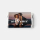 Hershey mini bar favors for your wedding guests you can personalize with a romantic photo of the happy couple. Welcome is written across as a white overlay in a bold calligraphy. Add your initials beneath!