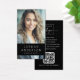 Modern, vertical business cards with your name and title on the front and customizable template fields for your contact information, logo and QR code on the back. You can change background and font colors, move and resize elements with the design tool.