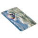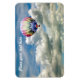 Rainbow colored Hot Air Balloon is flying high in the fluffy white clouds in a blue sky. Personalize with your own motivational text.