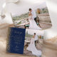 Send your family and friends a special wedding thank you with these custom photo cards. A vertical photo appears on the right half. On the left, the words "Thank You" appear in elegant gold-colored handwriting script typography on a navy blue background over a brief, editable message of thanks to your wedding guests in copperplate font, with your names below. A gold faux glitter border decorates the left edge. The reverse side provides space for a second, horizontal photo.