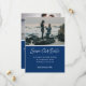 A Wedding Save the Date photo card with a navy blue background and white lettering. Add your photos, your names, wedding date and city/state. All fields can be personalized to make it your own. There is space on the front and back for two separate photos. You can add more information on the back with your wedding website.