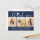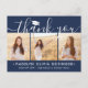 Send a stylish note of gratitude with custom 3 photo collage navy blue and white graduation thank you postcards. All pictures and wording are simple to personalize. (IMAGE PLACEMENT TIP: An easy way to center a photo exactly how you want is to crop it before uploading to the Zazzle website.) This template can be customized with any wording of your choice such as future education plans, new job position or favorite inspirational quote. If you prefer to hand write your message, simply delete the example text or use the extra space above the new address and contact info. Design features a navy blue background, white mortar board cap, handwritten style script calligraphy, modern minimalist typography, and three photos of your choice, such as senior pictures or images from the commencement ceremony. These elegant personalized cards are a trendy and chic way to thank family and friends for sharing your graduation celebration. Congratulations to the graduate!
