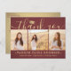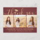 Send a stylish note of gratitude with custom 3 photo collage burgundy and gold graduation thank you postcards. All pictures and wording are simple to personalize. (IMAGE PLACEMENT TIP: An easy way to center a photo exactly how you want is to crop it before uploading to the Zazzle website.) This template can be customized with any wording of your choice such as future education plans, new job position or favorite inspirational quote. If you prefer to hand write your message, simply delete the example text or use the extra space above the new address and contact info. Design features a maroon red ombre background, faux foil mortar board cap, handwritten style script calligraphy, modern minimalist typography, and three photos of your choice, such as senior pictures or images from the commencement ceremony. Please note that gold is printed color, not metallic foil. These elegant personalized cards are a trendy and chic way to thank family and friends for sharing your graduation celebration. Congratulations to the graduate!