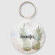 A key chain with a photograph featuring a pair of pineapples sitting on a sandy beach.