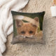 A pillow with a darling photograph featuring a little orange fox peering at you from behind a log out in the wilderness.