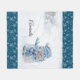 A blanket with a cute photograph of a little snowman. Standing outside in the winter with snow falling all around. This cute little guy is dressed up in blue knitted hat and scarf. Snowflake pattern with a dark blue background along the top and bottom border.