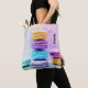 A tote bag with a delicious photo featuring a stack of colorful macarons. Vibrant colors that really pop.