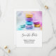 Save the date card with a delicious photo featuring a stack of colorful macarons.