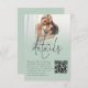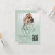 Available high quality printed to enclose with your invitations or as a convenient printable digital download. Minimalist Photo Overlay Script QR Code Wedding Sage Details Card. Invite your guests to view all the information they need such as accommodation and directions via your QR code to your wedding website. This modern sage green design with your favorite picture behind a graduated tinted layer, has an informal set typography in black for the main heading Details and the rest of the text which can you can easily personalise. Replace the sample photo with your own favorite of landscape orientation.
