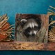 Plaque shown with a photo print of a cute wild raccoon in a tree in the forest.