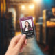 A modern photo press badge ID with name on burgundy red. .Simply add your photo and information. This version comes with a lanyard, but you may choose your style of attachment that includes, lanyard, metal clip or retractable, or no attachment.