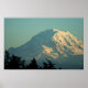 In this winter photo of Mt. Rainier, which rises 14,411 feet above Puget Sound about 50 miles southeast of Seattle, WA, the mountain shows its chilly side. Dark green evergreen trees at the lower left border the light blue foothills. Light on the right side of the mountain reflects off the snow-covered peak that almost fills the frame of the photograph, and blue shadows silhouette the left side, slightly darker than the blue evening sky. Brrr! Grab your muffler! Copyright Gail Storrs 2007.