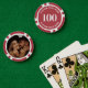 These custom poker chips feature a bold number on the front instead of initials, which can be personalized with any number up to four digits. The front showcases a vibrant red background with a matching red edge poker chip, paired with crisp white fonts for a bold and striking look. The back includes space for a photo, making them perfect for weddings, mancaves, bachelor parties, or as a memorable gift.