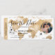 Destination Beach Wedding Boarding Pass Ticket Gold Plane Save the Date with heart and plane icon with tropical leaves. Add your photo