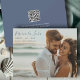 Announce your engagement with this modern save the date in Spanish, perfect for a destination wedding! Featuring 'Save Our Date' in trendy script typography, this simple yet elegant card beautifully displays your favorite couple photo in a full-bleed, horizontal layout. The coastal blue text overlay includes your names, wedding date, and location, setting the tone for a beach or ocean-inspired celebration. Ideal for couples seeking unique save the date ideas, this card reverses to a complementary solid blue back. To explore the full matching wedding suite, visit DoTellABelle on Zazzle.