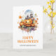 Custom watercolor happy Halloween card featuring pumpkins with scary faces, falling leaves and a haunted mansion on the front and a funny pumpkin, a lantern and bats at the back. Easily personalize this beautiful watercolor Halloween card with your family name, photo and text.