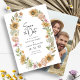 This modern save the date features stunning hand-painted watercolor pink and dusty blue wildflowers, beautiful yellow sunflowers, and sage greenery arranged as a lovely wreath that's perfect for those who love whimsical boho / bohemian elegance. Find matching items in the Modern Sunflower Wedding Collection.