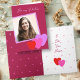 Photo card for Valentines Day. Burgundy red with felt hearts design and text to personalize on the front and inside. “Be my Valentine” on the front is at the top of folded cards that come in more sizes. The lavender framed photo is tilted and decorated with three hearts in red, pink and purple. Upload a photo with the subject in the center, either horizontal or vertical. Inside, add your own message of love in red script. A pattern of “love” hearts is printed on the inside left.