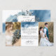 Tell family and friends the great news of your wedding with this elegant "We got Married" Two Photo Announcement Card. Feel free to add your own message, ours is simply an example. Simple and modern announcement card design with blue watercolor and hand written calligraphy details. Back of card with graceful blue watercolor stain and blue floral details encasing bride and grooms full names. Flowers and foliage in a combination of dusty blue, navy blue, white, gray and green sage tones.