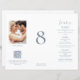IMPORTANT NOTE: This trifold is supplied flat, WITHOUT pre-scoring. You will to fold it yourself. To assist you with accurate folding, guidelines are printed on the back for the three panels, plus an extra thin panel to the right hand side for you to apply glue to stick the trifold together once you have folded it. All in 1 Photo Wedding Menu Table Number Blue Text Trifold. This handy DIY trifold combines your Table Number, Menu and Share the Love section with a QR code for your guests to scan and upload their pictures to your chosen website. The word "Menu" is in a set stylish script. Easily personalise the rest of the text as required and replace rhe sample image with your own. Change the sample URL of the QR code to that of your own URL and your QR code will automatically be generated to replace the sample code.