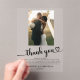 Express your gratitude with this elegant acrylic wedding thank-you card. Featuring a customizable photo section to highlight your favorite wedding moment, this design is both heartfelt and stylish. The transparent background adds a romantic touch, complemented by elegant script typography for your message of thanks. Perfect for newlyweds who want to share their appreciation with family and friends in a personal and timeless way.