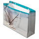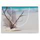 Gift bag with a gorgeous photograph. Tropical blue water and foamy surf in the background. A collection of seashells and stems set on a white sandy beach.