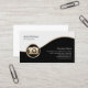 This photographer business card features black and white segments separated by a wavy gold strip. An elegant gold icon of a camera lies on the lower left side of the design, that's generally suitable for businesses or professions related to photography, camera, visual, entertainment, digital imaging, creative arts themes.