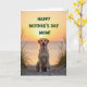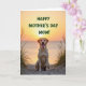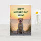 Designed with a tender golden glow like early morning or late evening light, the scene centers on a light-furred dog sitting calmly with bright amber eyes and a happy open mouth showing a small pink tongue ❤️. Sparse, wind-swept grasses rise from a sandy foreground, loosely framing the dog in a way that feels like a gentle embrace. In the distance, quiet water meets the horizon where the sun rests low, casting warm oranges and yellows that fade upward into soft creams. The overall setting suggests closeness and care, like a loyal companion waiting nearby while you watch the day begin. Near the top of the design, the message “HAPPY MOTHER’S DAY MOM!” is placed prominently in rich green lettering that stands out against the warm sky 🌼. The green text contrasts clearly with the sunset tones while still feeling naturally tied to the grassy foreground. The sun’s round edge touches the horizon line above the calm water, with the brightest color concentrated right where sky meets sea.